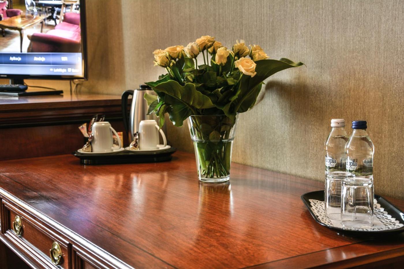 Apartament Prezydencki. Guests will have a special experience as this suite provides a hot tub. Offering free toiletries and bathrobes, this suite includes a private bathroom with a walk-in shower, a bath and a bidet. The spacious air-conditioned suite offers a flat-screen TV with cable channels, a minibar, a tea and coffee maker, a seating area as well as city views. The unit offers 1 bed. Apartament typu Suite - 3 osobowy. Powierzchnia pokoju ok.: 90 mkw. ;